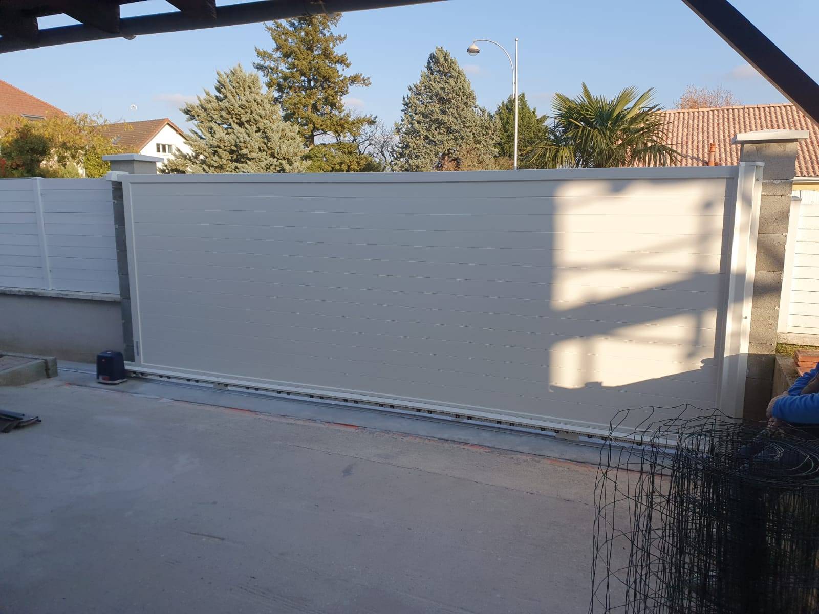Installation d'un portail de couleur blanche 1 vantail coulissant sur rail motorisé sur mesure à Genas - commune situé à 10 minutes de Lyon -