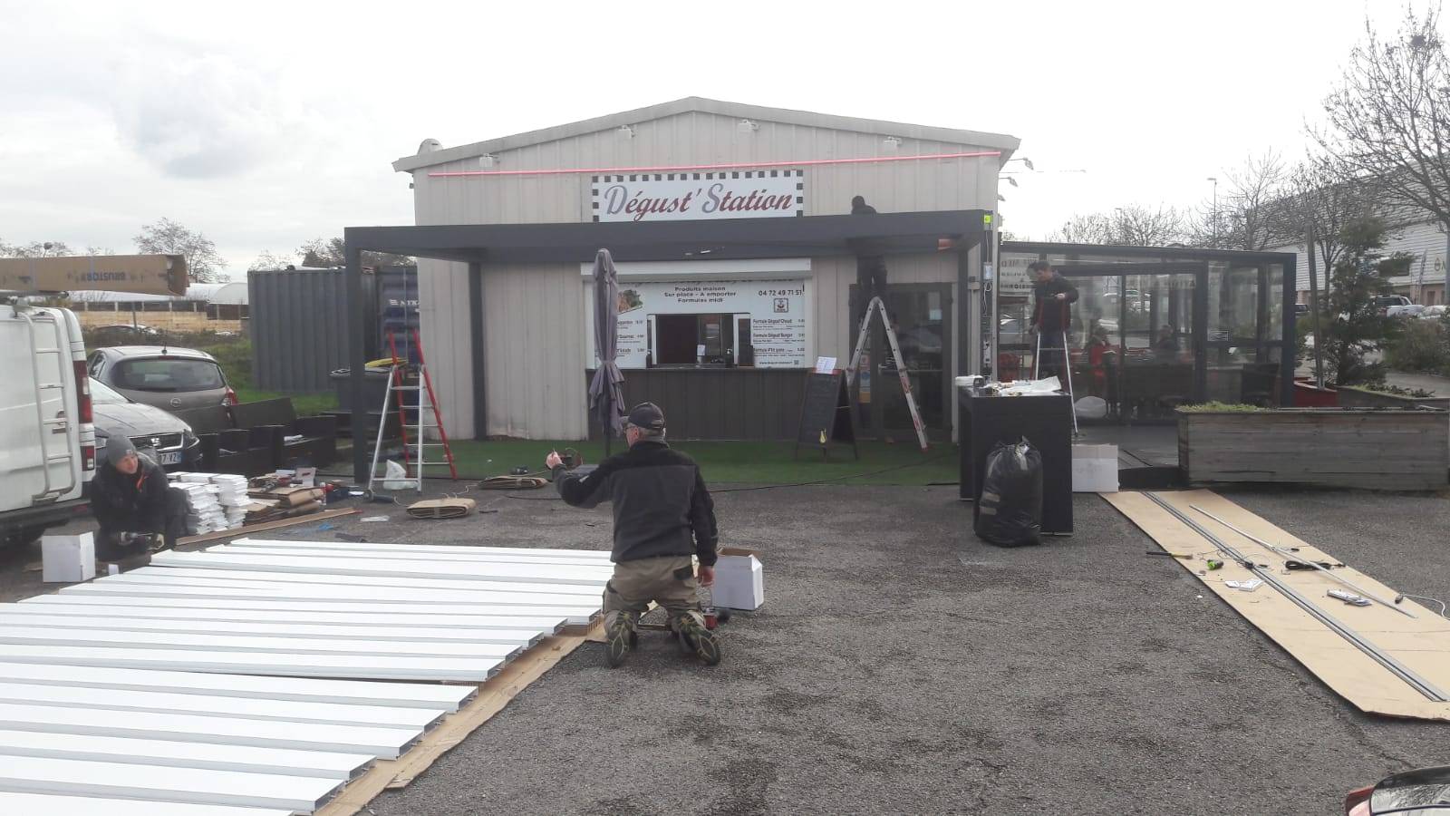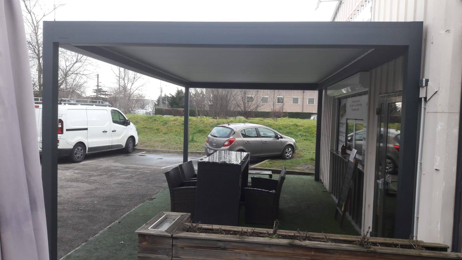 Installation pour un restaurant d'une pergola bioclimatique sur mesure et en aluminium à Craponne d'une largeur de 7m sur une profondeur de 4m