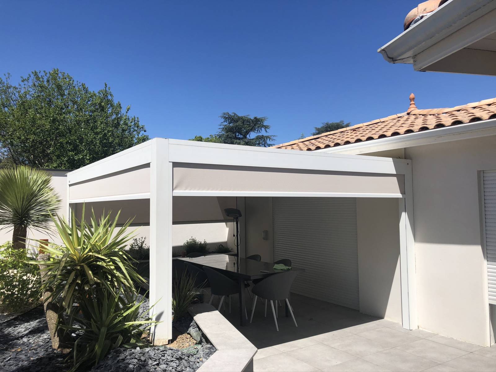 Installation d'une pergola bioclimatique sur mesure à Ecully (69) dans l'ouest Lyonnais avec structure en aluminium blanc et store de terrasse coquille d'oeuf.