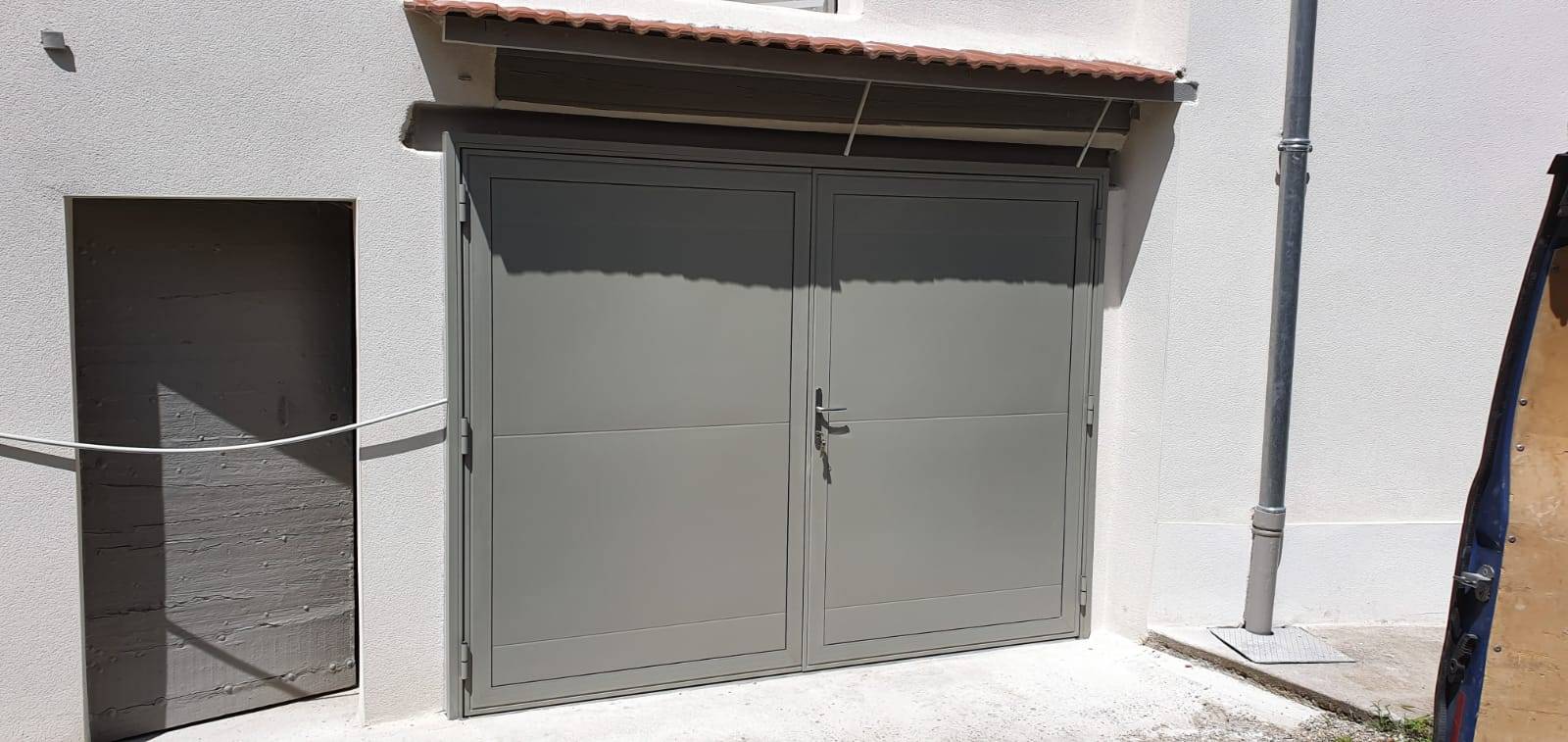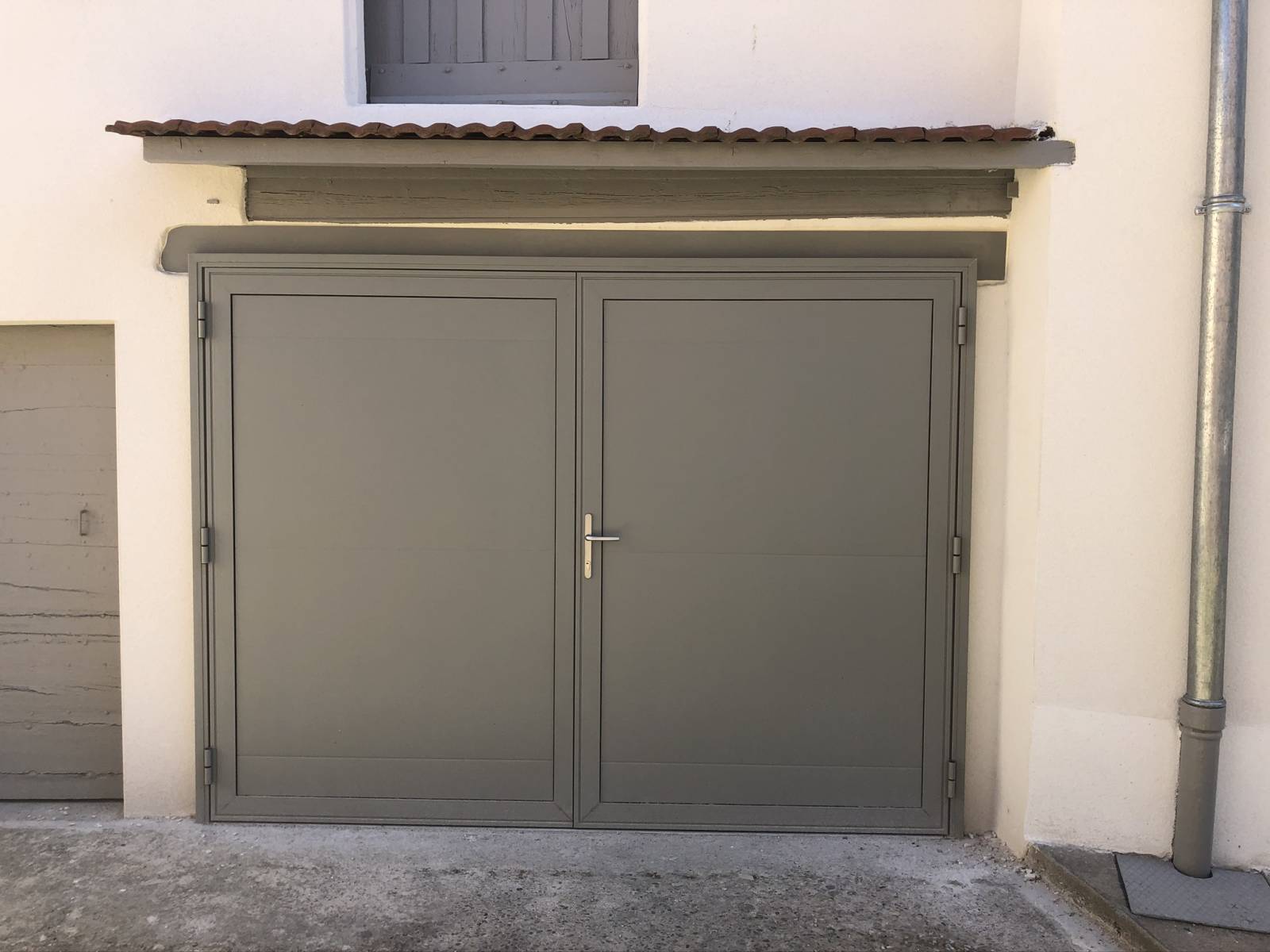 Installation d'une porte de garage bois battante à deux vantaux à Saint Genis Laval en coloris vert olive.