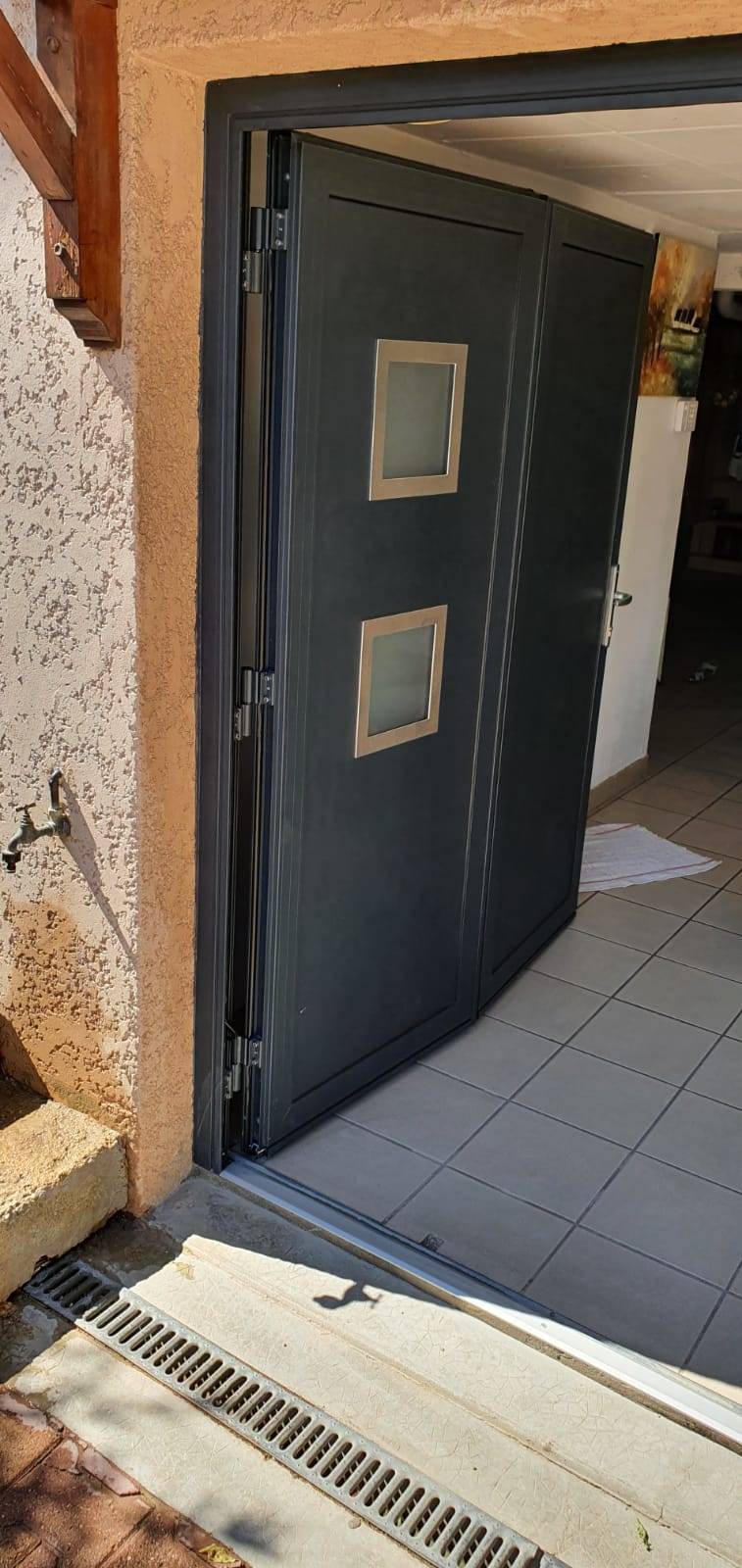 Pose d'une porte de garage battante deux vantaux gris anthracite avec hublots à Dardilly.